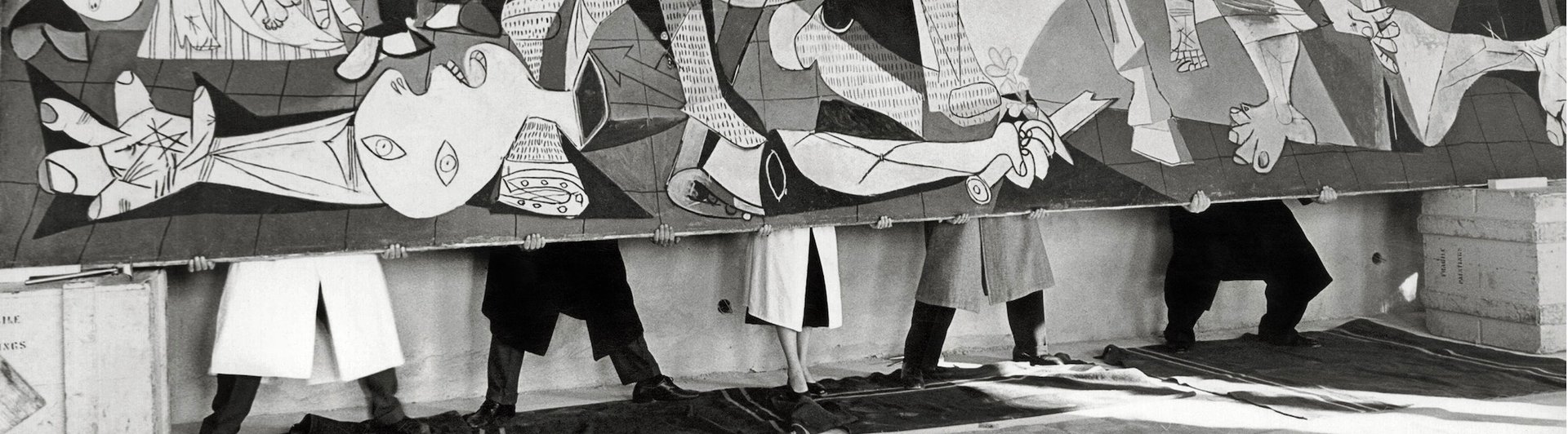 "Guernica de Pablo Picasso est une œuvre hors norme. Par ses dimensions extraordinaires, la toile embrasse le spectateur, l’assaille et le terrasse. Corps blessés à l’agonie, pleurs et hurlements. Noir, blanc, gris. Formes aiguës. Souffrance absolue. Radicale, Guernica est un choc visuel et esthétique né des horreurs de la guerre d’Espagne (1936-1939). Sa puissance implacable touche au plus profond de l’âme." (Isabelle Limousin, Dérouler Guernica)
